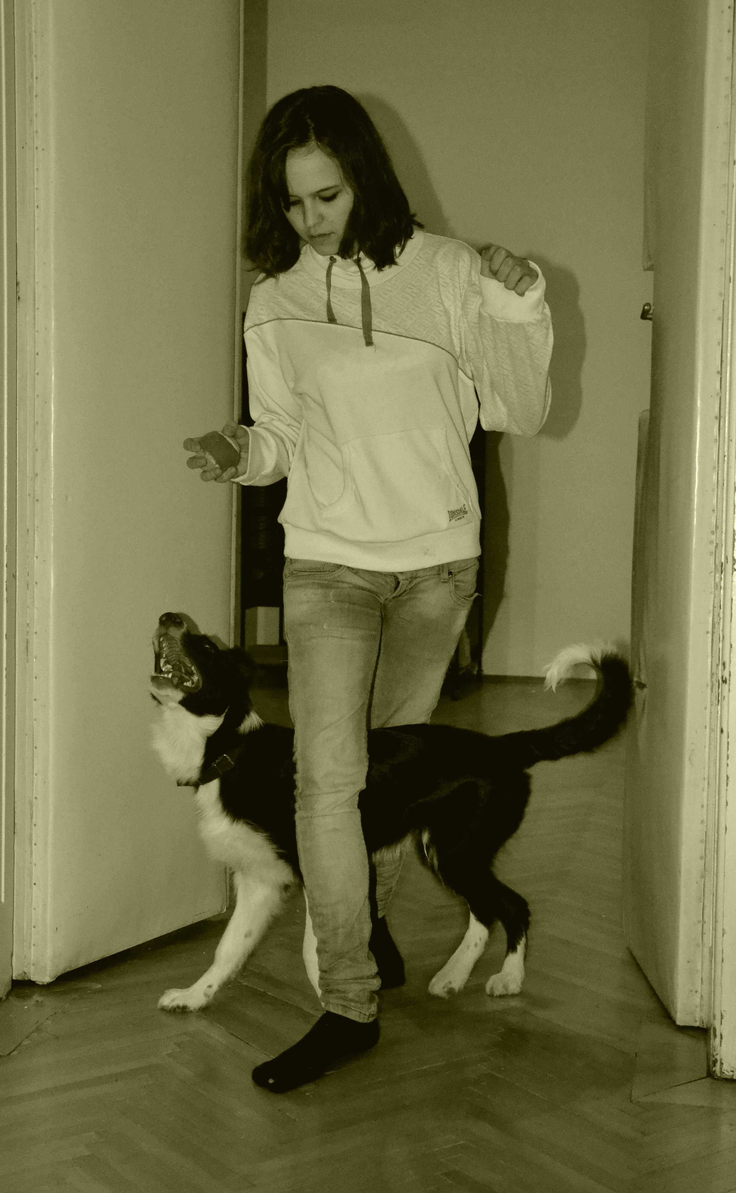 - Trhej - vezme do tlamy hadr a třepe hlavou